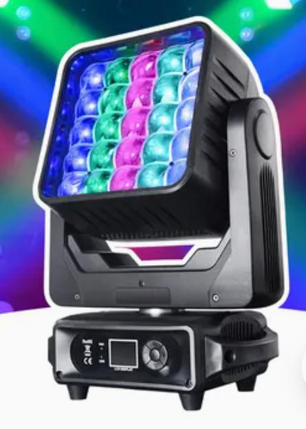 Lampu kepala bergerak matriks LED profesional yang menampilkan 25×15W RGBW 4-in-1 LED, menggabungkan kepala goyang, pewarnaan, dan fungsi fokus untuk efek pencahayaan panggung dan tarian yang dinamis.